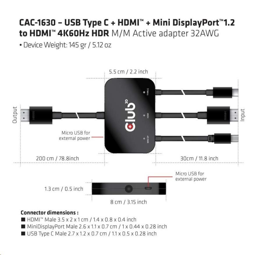| Product Name | CAC-1630 USB Type C* + HDMI™ + Mini DisplayPort™1.2 to HDMI™ 4K60Hz HDR M/M Active adapter 32AWG |