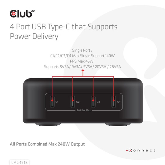 Cestovní nabíječka Club 3D CAC-1918 240 Watt GaN technologie, čtyřportový USB Type-C, Power Delivery (PD) 3.1 a podpora PPS je vysoce výkonná cestovní nabíječka s módním designem. Všestrannost: Perfektní řešení pro potřeby obchodních cestujících a náročných uživatelů a více portů. To znamená, že pro všechna vaše moderní zařízení potřebujete pouze jednu nabíječku a nemusíte se bát nosit více adaptérů.