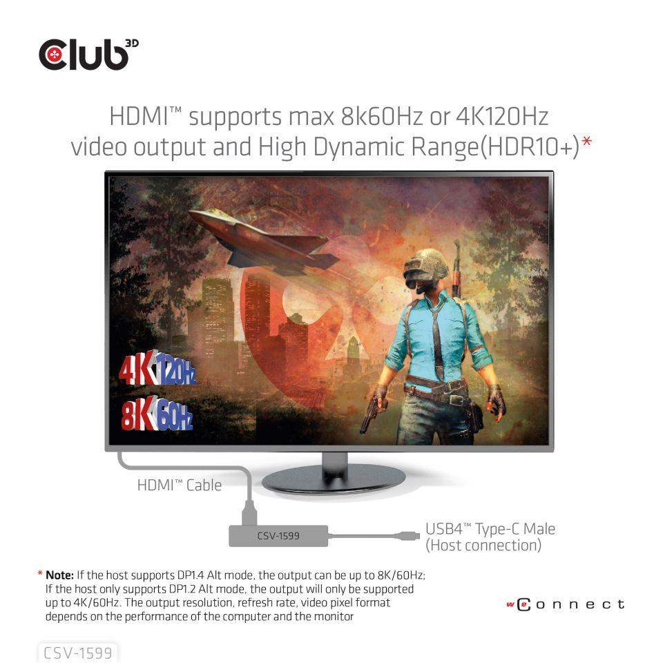 The Club 3D CSV-1599 is a USB4™ Gen3x2 Type-C, 6-in-1 Hub with HDMI™ 8K60Hz or 4K120Hz, 2xUSB Type-A(10G), Ethernet RJ45(2.5G) and 2xUSB Type-C, 1x Data(10G) and 1xPD3.0 charging 100 watt, this adapter is offering an integrated solution for video, data, power and Ethernet. It has a HDMI™(8K60Hz) for video transmission, 3 USB data ports (2 USB-A 10G, 1 Type-C 10G)for data transmission, a 2.5Gbps Ethernet port for surfing on line. Besides, this adapter is equipped with Type-C PD3.0 Charging port with max 100W power supply. It can work on USB4™, Thunderbolt4, Thunderbolt3 and DP Alt mode (15W is dedicated to the functioning of this product, the rest power(max 85W) will be passed to charge for the host. This 6-in-1 Hub will work on all DP Alt mode supported Type-C hosts.