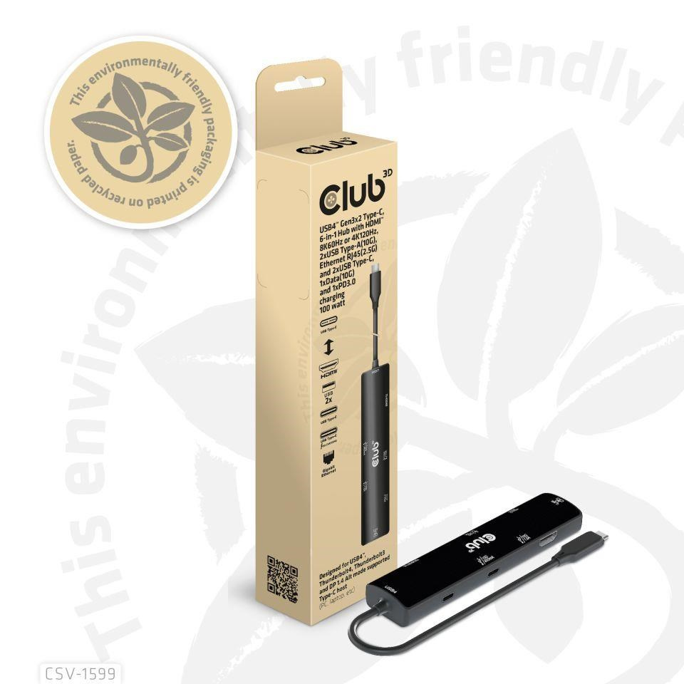 Club3D hub USB Gen3x2 Type-C (USB4), 6-in-1 s HDMI 8K60Hz/4K120Hz, 2xUSB, RJ45 a 2xUSB-C, 1xData, 1xPD - nabíjení 100W