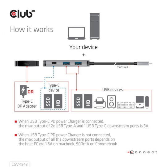 The Club 3D CSV-1543 is an USB Gen2 Type-C PD Charging Hub to 2x Type-C 10G ports and 2x USB Type-A 10G ports.The two USB Type-A ports are designed for transmitting data and one of the two USB Type-A ports can provide 1.5A charging for the connected USB Type-A devices (mobile phones, tablets, U-disk, etc). One of the two USB Type-C ports is designed for transmitting data and charging for the connected USB Type-C device, the other USB Type-C port supports both data and PD3.0 charging. It can work on any USB Type-C host (PC, notebook, tablet, Mobile phone, etc) that supports DP Alt mode.