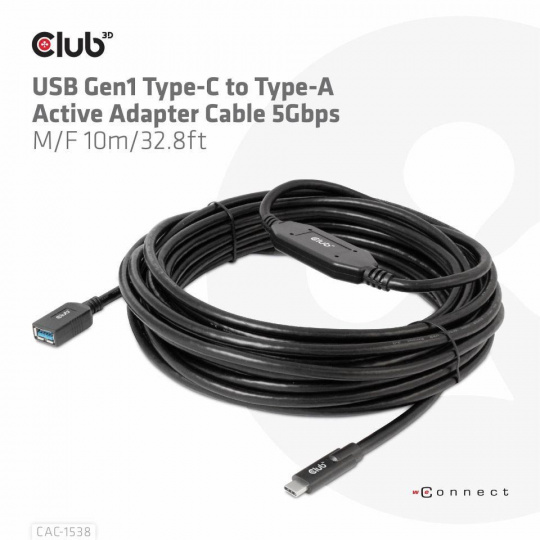 The Club 3D CAC-1538 USB Gen1 Type-C to Type-A Active Adapter Cable 5Gbps M/F 10m / 32.8ft connects your Notebook, Tablet or Phone with USB Type-C output to your favorite existing Peripherals, Accessories and Chargers featuring the common USB Type-A plug. It enables Data and Power over a single cable and both ways. This cable supports USB Gen1. SuperSpeed+ data up to 5Gbps and up to 900mA output for Downstream charging or powering your USB Type-A enabled Notebook, Tablet or Smartphone.