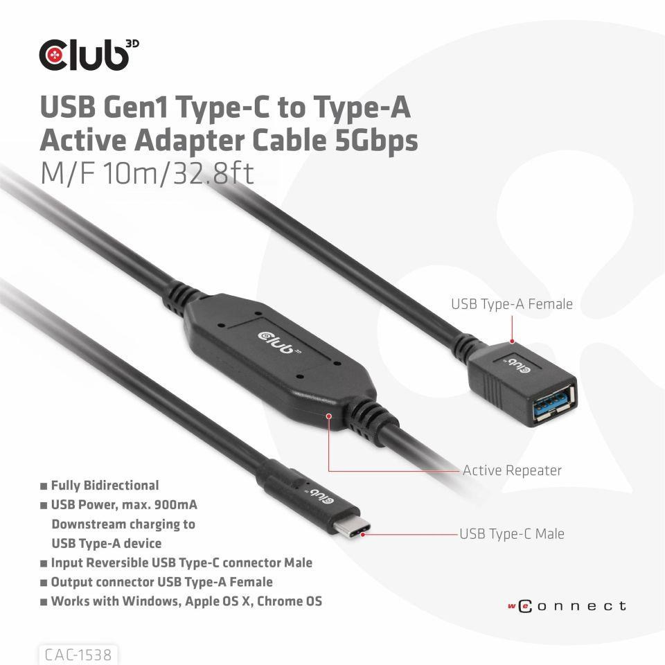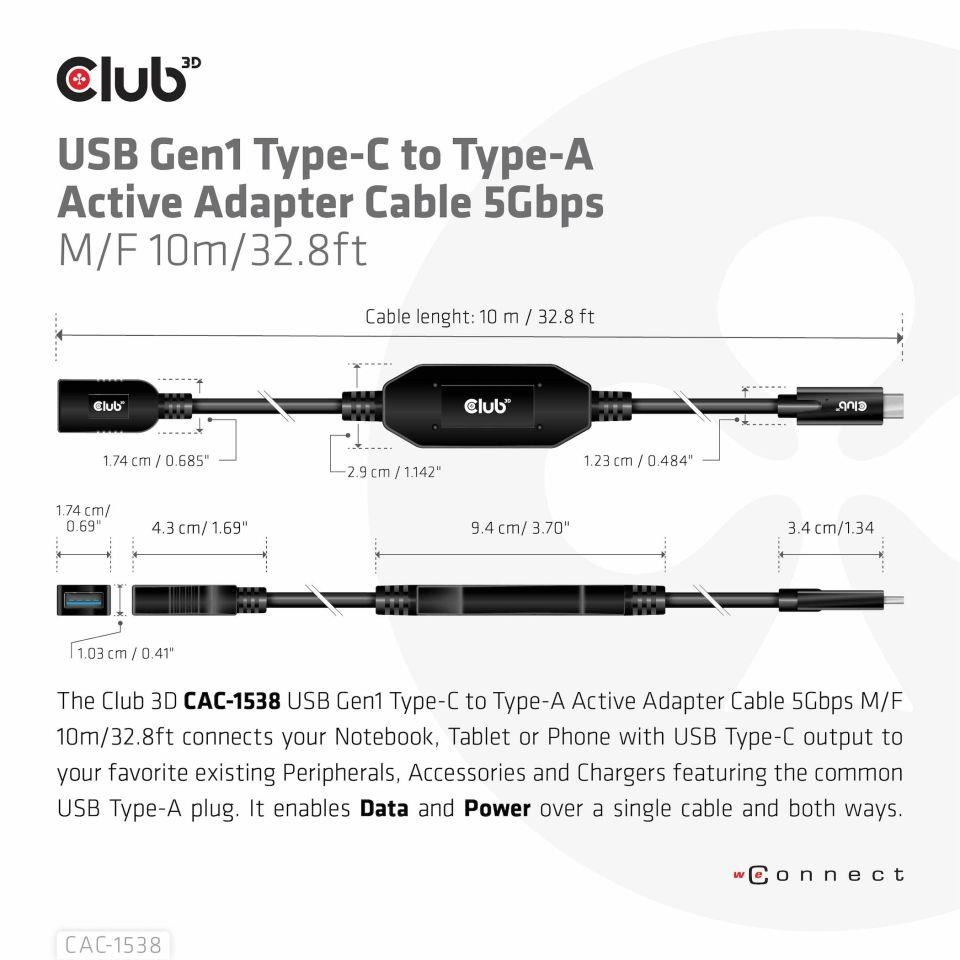 The Club 3D CAC-1538 USB Gen1 Type-C to Type-A Active Adapter Cable 5Gbps M/F 10m / 32.8ft connects your Notebook, Tablet or Phone with USB Type-C output to your favorite existing Peripherals, Accessories and Chargers featuring the common USB Type-A plug. It enables Data and Power over a single cable and both ways. This cable supports USB Gen1. SuperSpeed+ data up to 5Gbps and up to 900mA output for Downstream charging or powering your USB Type-A enabled Notebook, Tablet or Smartphone.