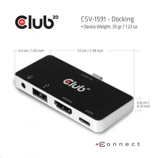 Club3D Dokovací stanice pro mobilní telefony USB-C 4v1, 1xHDMI, 1xUSB-C, 1xUSB, 1x3.5mm, černá