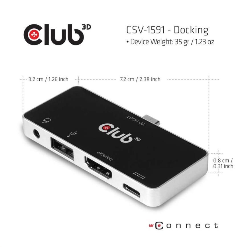 CSV-1591 - The Club 3D Hub is a 4-in-1 USB Type-C hub with HDMI™, USB Type-A 2.0, 3.5mm audio and USB Type-C PD charging, the design perfectly suits all DP Alt-mode capable devices. With this hub, you can enjoy ultra high definition video of your host on big screen, enjoy fantastic music, transmit USB 2.0 data and connect USB Type-C PD Adapter to charge the host.