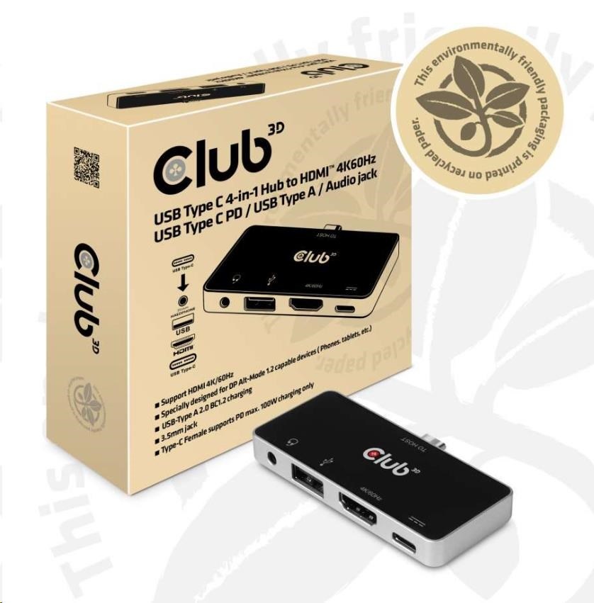 Club3D Dokovací stanice pro mobilní telefony USB-C 4v1, 1xHDMI, 1xUSB-C, 1xUSB, 1x3.5mm, černá