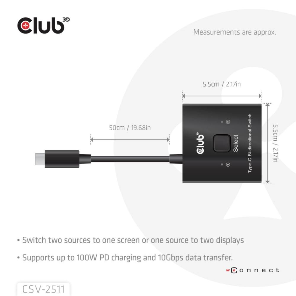 Plnohodnotný obousměrný přepínač Club 3D CSV-2511 může přepínat dva zdroje na jeden displej nebo jeden zdroj na jeden ze dvou displejů. Tento přepínač podporuje více rozlišení a až 8K nebo přenos dat max. 10 Gb/s nebo nabíjení PD3.0 max. 100 W PD. Může pracovat na všech hostitelských zařízeních USB-C®, kompatibilních se zařízeními Thunderbolt.