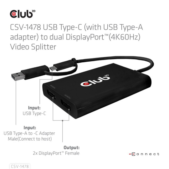 Club 3D CSV-1478 USB Type-C (s adaptérem USB-A) na duální DisplayPort™ (4K60Hz) Video Splitter s DisplayLink®, který poskytuje nejpokročilejší a nejefektivnější řešení. Podporuje max. jeden 4K60Hz nebo duální 4K60Hz simultánní výstup různých videí (Extened Desktop). Může pracovat v režimu USB a režimu DP™ Alt s podporou hostitelů USB Type-C a USB Type-A.
