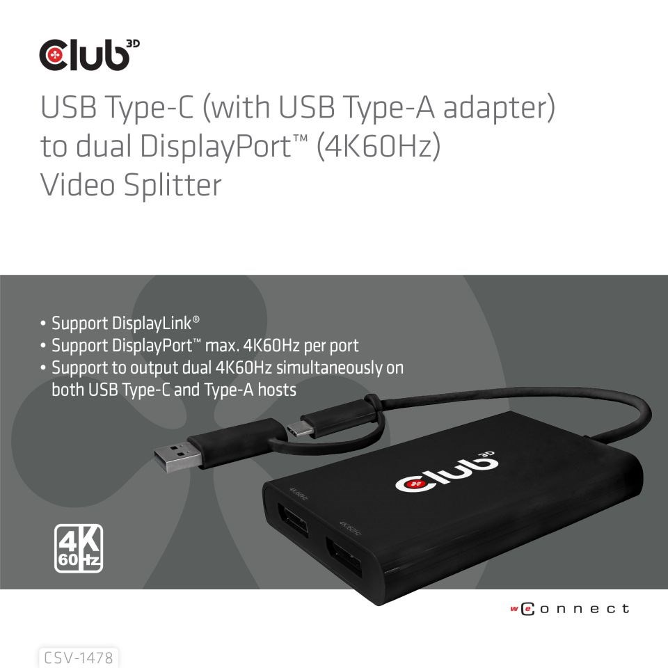 Club 3D CSV-1478 USB Type-C (s adaptérem USB-A) na duální DisplayPort™ (4K60Hz) Video Splitter s DisplayLink®, který poskytuje nejpokročilejší a nejefektivnější řešení. Podporuje max. jeden 4K60Hz nebo duální 4K60Hz simultánní výstup různých videí (Extened Desktop). Může pracovat v režimu USB a režimu DP™ Alt s podporou hostitelů USB Type-C a USB Type-A.