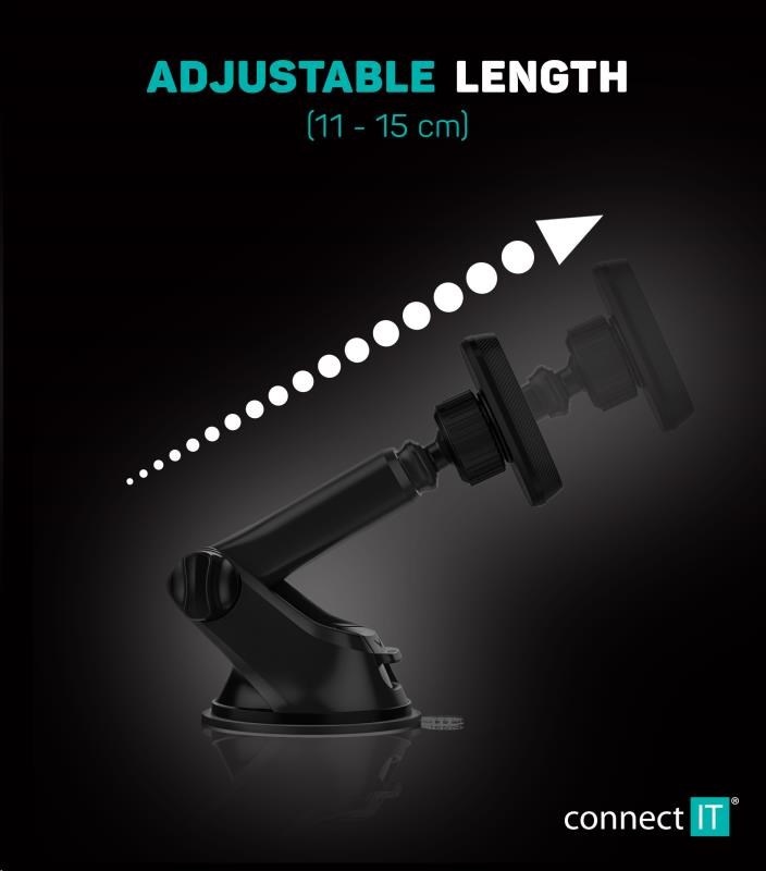- Nastavitelná délka ramena v rozsahu 11 až 15 cm vyhovuje i velmi zkoseným čelním sklům nebo atypickým palubním deskám