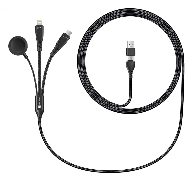 Univerzální nabíjecí kabel 6v1 pro nabíjení zařízení s konektory 1x USB-C, 1x Lightning a 1x nabíječka na chytré hodinky (kompatibilní s Apple Watch) se vstupním konektorem USB-C a redukcí na USB-A. Umožňuje nabíjení až tří zařízení současně s podporou rychlého nabíjení pomocí max. proudového toku 5 A. Speciální manžetová nadstavba konektorů zaručuje lepší přístupnost k nabíjecím zdířkám mobilních telefonů v pouzdrech.