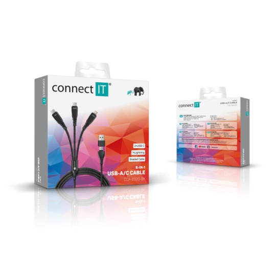 Univerzální nabíjecí kabel 6v1 pro nabíjení zařízení s konektory 2x USB-C,1x Lightning se vstupním konektrom USB-C a redukcí na USB-A. Umožňuje nabíjení až tří zařízení současně s podporou rychlého nabíjení pomocí max. proudového toku 5 A. Speciální manžetová nadstavba konektorů zaručuje lepší přístupnost k nabíjecím zdířkám mobilních telefonů v pouzdrech.