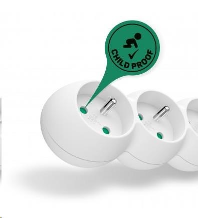 Prodlužovací kabelový přívod na 230V je vybaven dětskou ochranou všech zásuvek – zásuvky jsou přístupné pouze v případě zasunutí obou vidlic najednou, nelze tedy zasunout jednotlivě např. pouze šroubovák nebo pletací jehlici.