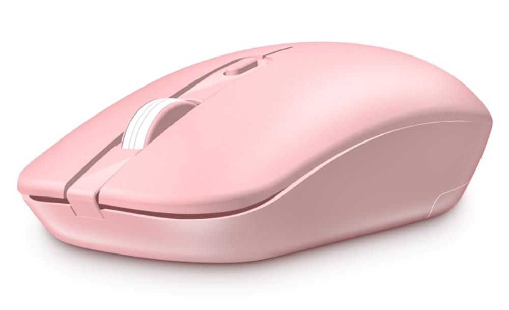 Bezdrátová klávesnice a optická myš v elegantním růžovém designu, určena pro domácí i profesionální použití v kancelářích a firmách.