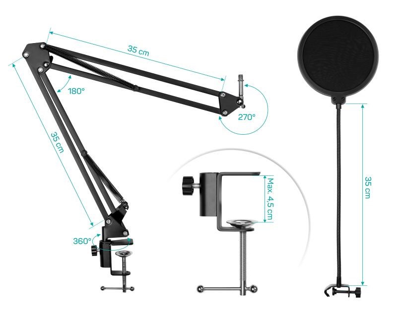 Teleskopické rameno s pružinovým mechanismem a třemi klouby pro snadné nastavení výšky a úhlu mikrofonu, který je bezrezonančně uchycen v držáku. Průměr POP filtru 15 cm zajištuje dokonalou ochranu a prodlužuje životnost mikrofonu.