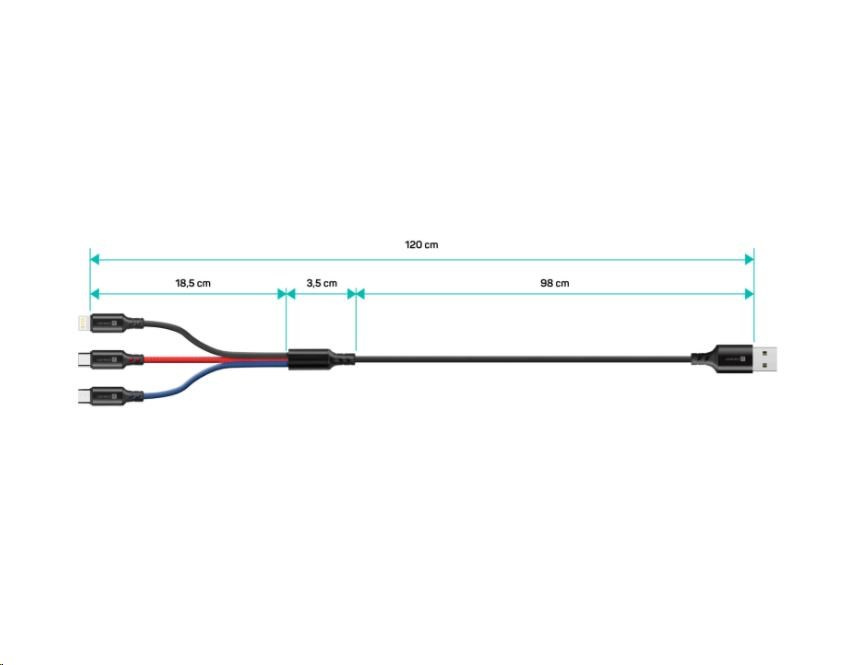 Univerzální nabíjecí kabel 3v1 na nabíjení zařízení s konektory Micro USB, Lightning a USB-C (Type C) umožňuje nabíjení až tří zařízení současně s podporou rychlého nabíjení pomocí max. proudového toku 2 A. Speciální manžetová nadstavba konektorů Micro USB, Lightning i USB-C (Type C) zaručuje lepší přístupnost k nabíjecím zdířkám mobilních telefonů v pouzdrech.