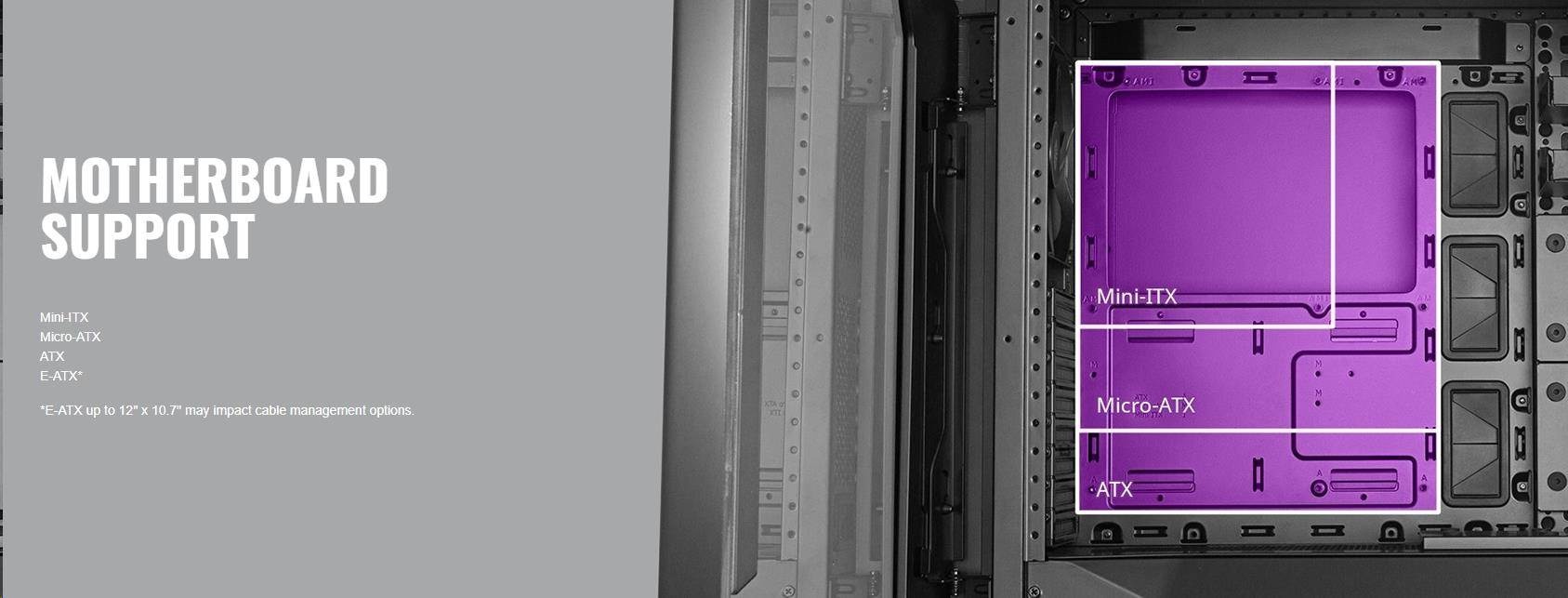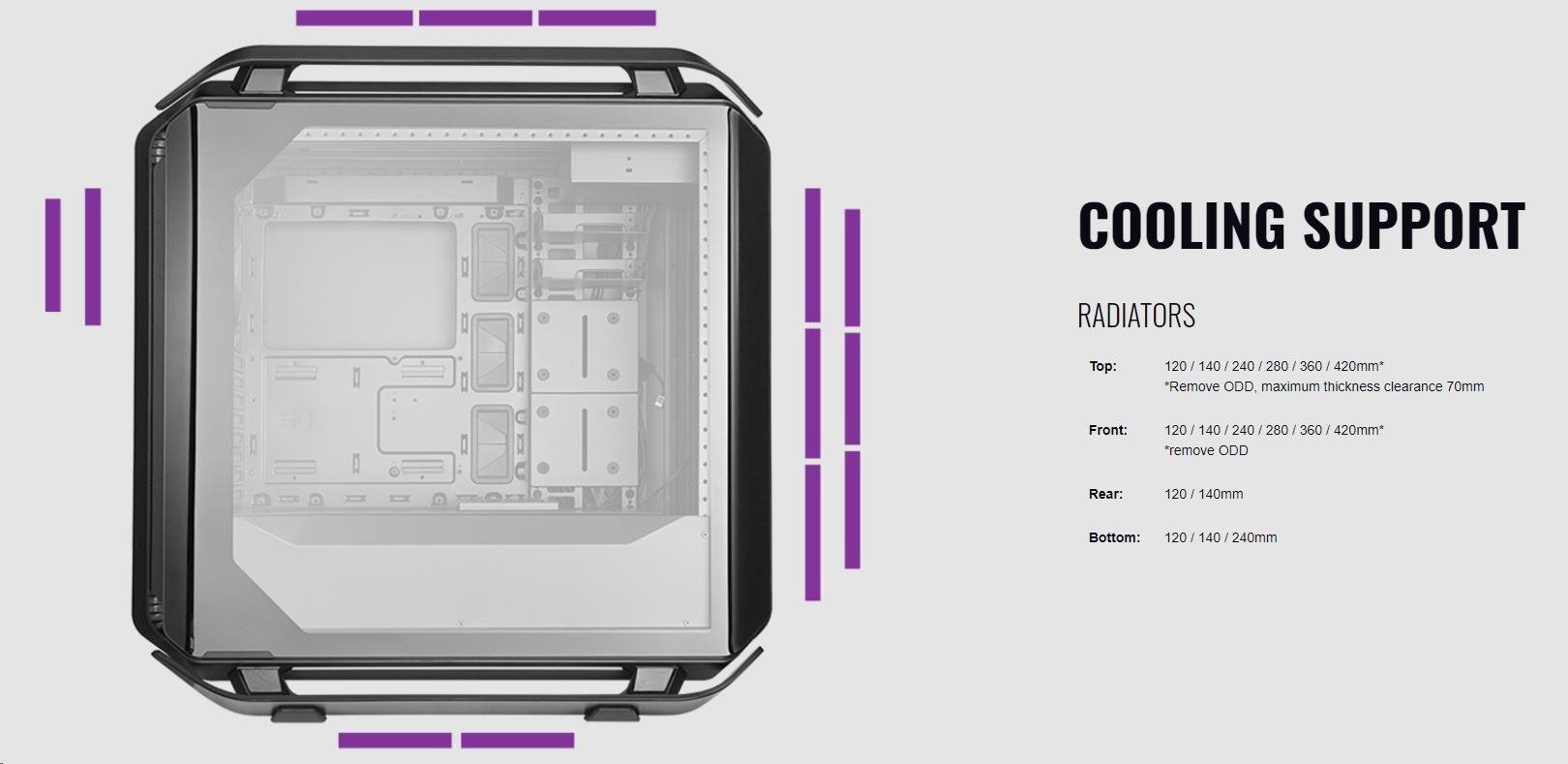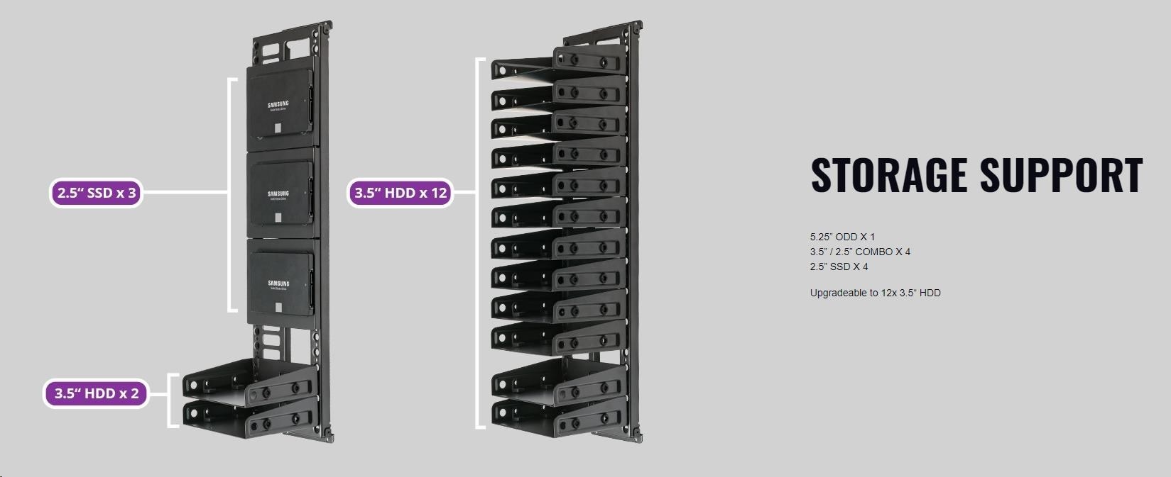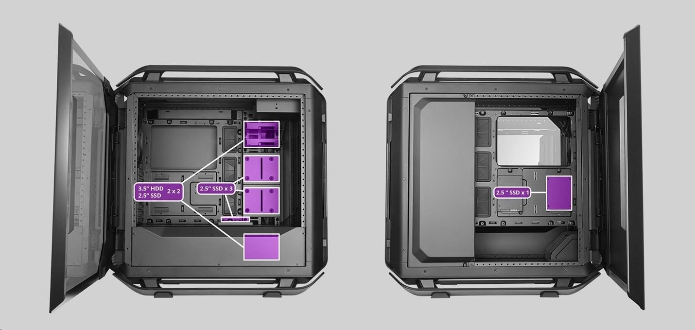 Kryt PSU je modulární díky dvěma nezávislým dílům, zatímco systém krytu kabelů obsahuje 3 samostatné díly, z nichž každý umožňuje montáž úložiště nebo čerpadla pro kapalinové chlazení.