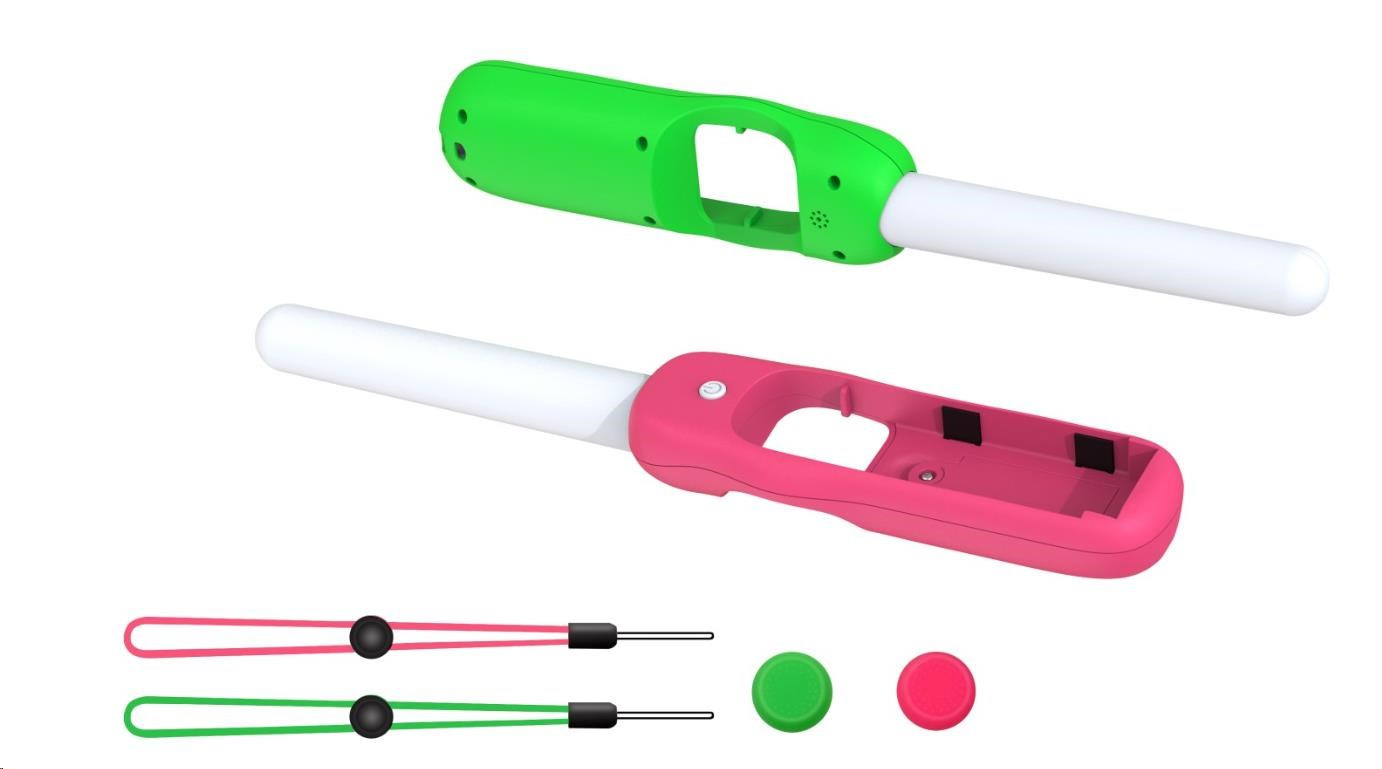 Dance ‘N’ Play Kit obsahuje 2x svíticí tyčinky LED citlivé na zvuk, s růžovým a zeleným úchytem a zápěstními řemínky. Svíticí tyčinky LED citlivé na zvuk s vícebarevným efektem duhového podsvícení budou fungovat, pulzovat, zářit a tančit podle jakéhokoliv zvuku. Ať už půjde o hudbu, nebo zvuky ze hry, Dance ‘N’ Play Kit prozáří váš pokoj.