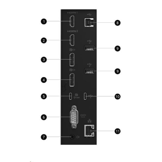 | HDMI 1 ? HDMI 2 ? DisplayPort (in) ? DisplayPort (out) ? USB 3.2 Gen1 Type-C upstream (Alt mode with DP 1.4, up to 90W PD) ? RS232 ? Audio line-out ? USB 3.2 Gen1 Type-B (5Gbps) upstream ? USB 3.2 Gen1 Type-A (5Gbps) downstream (2) ? USB 3.2 Gen1 Type-C (5Gbps) downstream (up to 15W PD) ? RJ45