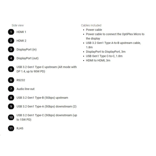 | Power cable ? Power cable to connect the OptiPlex Micro to the display ? USB 3.2 Gen1 Type A-to-B upstream cable, 1.8m ? DisplayPort to DisplayPort, 3m ? USB Gen1 Type C-to-C, 1.8m ? HDMI to HDMI, 3m |