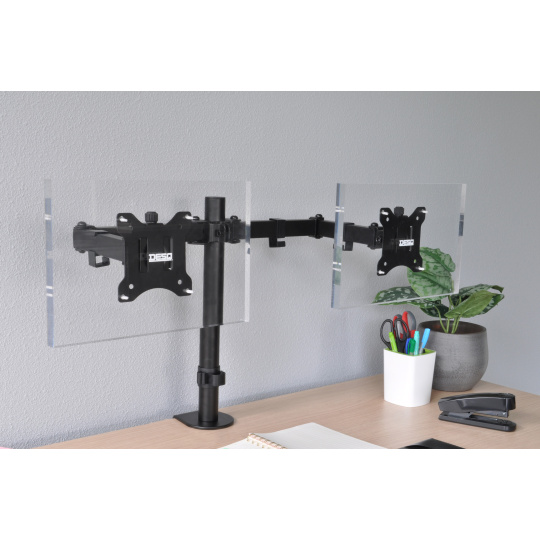 Maximalizujte svůj pracovní prostor s DESQ Dvojitým ramenem na monitor, ideálním pro domácí kancelář, práci, gaming nebo studium. Toto ergonomické řešení umožňuje přesné nastavení výšky, úhlu a rotace monitorů, což zvyšuje komfort a efektivitu práce. ? Montáž pomocí C-Clamp + Desk-thru pro flexibilní a bezpečné uchycení ? Jemné nastavení výšky každého monitoru pomocí regulačního šroubu ? Rychloupínací VESA deska pro snadnou instalaci monitorů ? Kompatibilní s monitory od 17” do 32” (VESA 75x75 mm a 100x100 mm) ? Nosnost 9 kg na každé rameno – spolehlivá podpora většiny monitorů ? Možnost snadné rotace mezi režimem na výšku a na šířku ? Držák na imbusové klíče – nástroje vždy po ruce S DESQ dvojitým ramenem na monitor si nastavíte výšku, vzdálenost a úhel monitorů přesně podle vašich potřeb. To pomáhá snížit namáhání krku, zad a očí a zároveň uvolnit cenný prostor na stole..