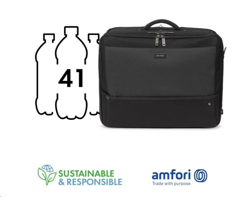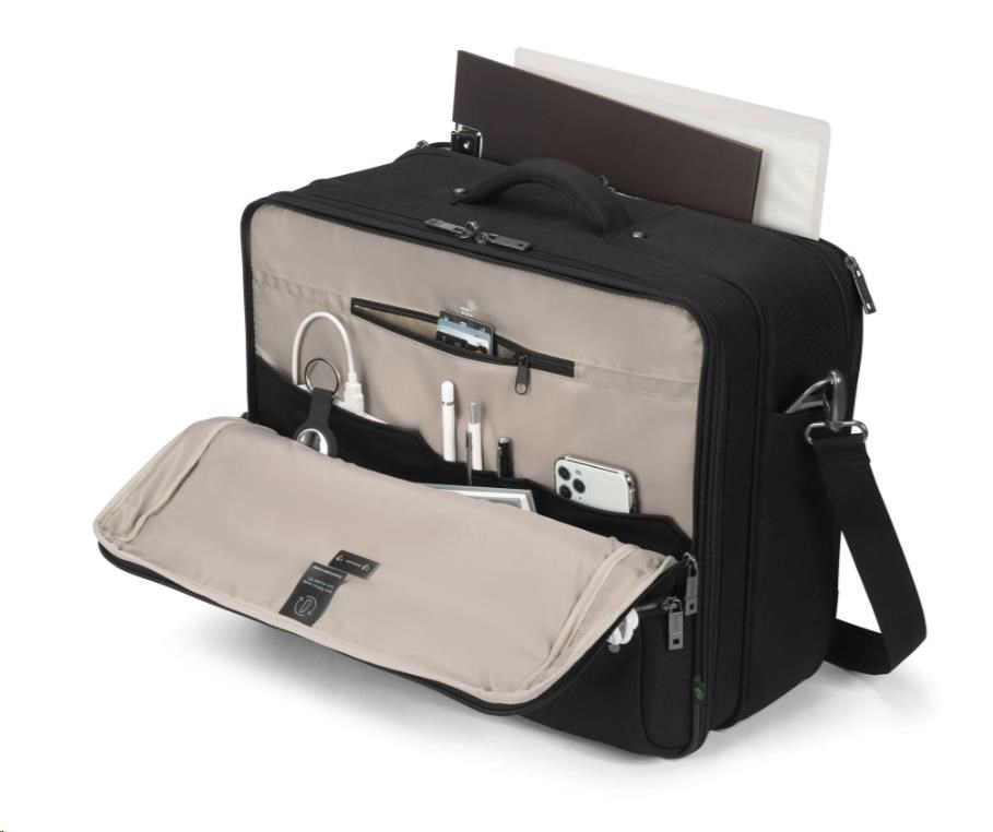 MULTI TWIN FIVE je bezpečný, funkční a ekologický společník pro každodenní pracovní potřeby. Uzamykatelná přihrádka na notebook s pěnou HDF poskytuje robustní ochranu, zatímco vnitřní přihrádka na tablet zajišťuje, že menší zařízení jsou stejně bezpečná. Ve vyhrazené zadní přihrádce jsou uspořádány dokumenty, zatímco přední část nabízí strukturované kapsy na příslušenství. Tato brašna, promyšleně navržená pro pohodlí, je navíc vyrobena ze 41 recyklovaných PET lahví, což spojuje udržitelnost s každodenní praktičností.