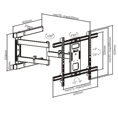Držák LCD LED Tv Fiber Mounts TALL1 Vynikající nástěnný držák na Tv 37-80", otočný, sklopný, výsuvný, VESA standardy 200x100 až 600x400, nosnost 50kg Kvalitní nástěnný držák na LCD, LED a plazmové televize s úhlopříčkou 37-80". Držák má kvalitní konstrukci, která unese televize s hmotností až 50kg, spolehlivou a bezpečnou instalaci na stěnu zaručují delší nástěnné lišty, díky nimž se celková hmotnost rozloží na velkou plochu. Podporuje VESA standardy pro zavěšení Tv s roztečí 200x100 až 600x400. Držák TALL1 umožňuje televizí otáčet do stran, naklápět, vysouvat a přisouvat ke zdi, snadno upravit rovinu obrazu. Barevné provedení černé. Záruka 5 let. Kvalitní držák Tv 37-80", otočný, sklopný a výsuvný - Fiber Mounts TALL1 Technické údaje: nosnost 50 kg vhodný na televize s úhlopříčkou 37-80" podporuje VESA standardy 200x100 až 600x400 výsuvný od zdi v rozmezí 76 - 620 mm otáčení do stran +/- 90° náklon Tv +3° až -15° korekce roviny +/- 3° kvalitní konstrukce prodloužené nástěnné lišty pro bezpečné ukotvení a perfektní rozložení hmotnosti velmi snadná instalace díky šabloně na předvrtání děr do zdi barevné provedení černé záruka 5 let Výsuvný držák Tv 37-80", otáčení Tv do stran, naklápění Tv - Fiber Mounts TALL1 Nástěnný držák na Tv Fiber Mounts TALL1 podporuje VESA standardy: VESA 200x100 VESA 200x200 VESA 300x200 a 200x300 VESA 300x300 VESA 400x200 a 200x400 VESA 400x300 a 300x400 VESA 400x400 VESA 600x400 Držák Tv Fiber Mounts TALL1 je vhodný na všechny televize, které podporují kterýkoliv z výše uvedených VESA standardů a jejichž hmotnost není vyšší jak 50kg. Nástěnné lišty o délce 423mm zajistí spolehlivé a bezpečné ukotvení držáku do zdí. Každá lišta má 3 kotvící otvory. Díky tomu se celková hmotnost perfektně rozloží na velkou plochu a je zaručena vyšší bezpečnost. Držák je vhodný na instalaci na klasické cihlové, betonové a dřevěné zdi, ale i siporexové nebo z dutých cihel (u posledních dvou je nutné zakoupit k tomu určené hmoždinky). Instalace na sádrokartonové zdi je možná pouze v případě ukotvení do nosníků nebo výdřevy, samotný sádrokarton pro instalaci vhodný není..