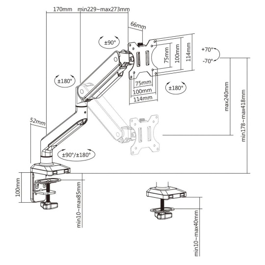 Držák monitoru Tv nebo All in One Fiber Mounts FM445 Profesionální stolní držák na monitor Tv All in One 15-35", otočný +/- 180°, sklopný +/- 45°, nastavitelná výška 178-418mm, výškové polohování 240mm, délka max. 443mm, 2 typy úchytů na stůl, VESA 75x75 a 100x100, nosnost 15kg Stolní držák na monitor nebo televizi s úhlopříčkou 15-35" v naprosto precizním provedení, špičkové kvalitě a profesionálním pojetím v každém detailu. Držák vyniká vysokou nosností plynové pružiny s nastavením od 1kg až do 15kg, je proto vhodný jak pro lehké a malé monitory, tak i pro velké monitory nebo All in One monitory. Nastavitelná výška od stolové desky od 178mm až do 418mm, výškový rozsah 240mm. Otáčení do stran bez omezení, naklápění ve velkém rozsahu až +/- 45°, nastavení vzdálenosti od stolního úchytu max. 443mm, funkce pivot, systém vedení kabeláže, 2 typy stolních úchytů (na okraj nebo do prostoru), instalační materiál. Držák je nejvyšší kvality a splní potřeby i náročných uživatelů. Barevné provedení černé, záruka 3 roky. Profesionální stolní držák na monitor nebo All in One Pc Fiber Mounts FM445 Technické údaje: nosnost 15kg na monitory a Tv s úhlopříčkou 15-35" podporuje VESA standardy 75x75 a 100x100 výškové polohování 240mm, výška od stolové desky 178-418mm otáčení do stran +/- 180° naklápění +/- 45° vzdálenost od úchytu 0-443mm funkce pivot (horizontální nebo vertikální natočení obrazovky) systém vedení kabeláže 2 typy stolních úchytů, na stolové desky 10-85mm barevné provedení černé záruka 3 roky Držák na monitor nebo All in One Pc v nejvyšší kvalitě s nosností 15kg Fiber Mounts FM445 Stolní držák monitoru Tv Fiber Mounts FM445 podporuje VESA standardy: VESA 75x75 VESA 100x100.