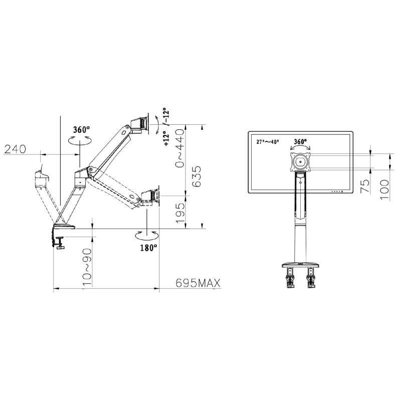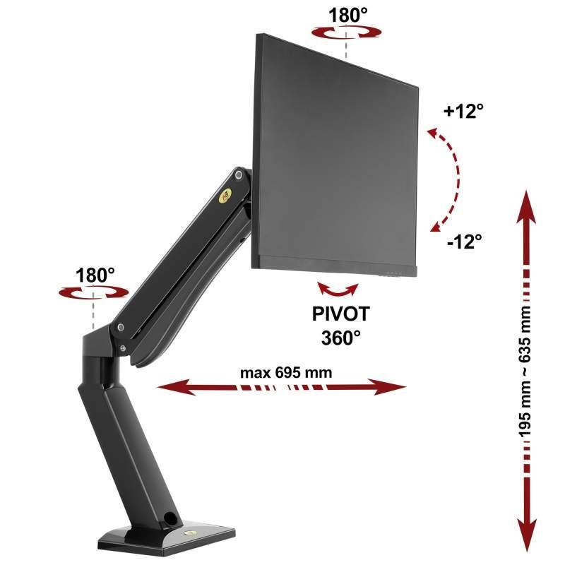 Stolní polohovatelný držák na monitor nebo Tv NB NB45B Stolní držák na monitor nebo Tv 27-43", otočný +/-180°, sklopný +/-12°, nastavení výšky 195-635mm, délka dle otočení 0-695mm, pivot, vedení kabeláže, 2 typy stolních úchytů, VESA 75x75 a 100x100, nosnost 15kg Profesionální stolní držák na velké monitory s úhlopříčkami 27" až 43". Držák je plně polohovatelný ve 3D - otáčení do stran, naklápění, výškové polohování, rotace monitoru, vzdálenost od stolního uchycení. Rameno držáku má integrovaný plynový píst, který snadno nastavíte na hmotnost zavěšeného monitoru, poté již můžete monitor libovolně výškově polohovat velmi snadno a rychle bez nářadí, pouze jednou rukou. Držák je špičkové kvality, je vhodný i do provozů, kde je nutné neustálé upravování polohy monitoru. Rameno držáku má integrované krytky pro skryté vedení kabeláže. Uchycení na stolové desky (jakékoliv vodorovné desky) o průměru 10mm až 90mm. Uchycení je možné buď na okraj desky (2 svěráky) nebo kamkoliv do prostoru (nutný 1 otvor o průměru 10-50mm). Barevné provedení černé. Záruka 3 roky. Profesionální stolní držák na monitor nebo Tv NB NB45B Technické údaje: nosnost (nastavitelné zatížení) 3kg až 15kg na monitory a televizory s úhlopříčkou 27" až 43" VESA standardy 75x75 a 100x100 (možnost rozšíření) 3D nastavení polohy otáčení do stran +/- 180° vzdálenost max. 695mm od uchycení výška 195mm až 635mm náklon +/- 12° rotace obrazovky (PIVOT) - otočení do vodorovné nebo svislé polohy nejvyšší kvalita zpracování systém pro vedení kabeláže 2 typy uchycení na stolové (vodorovné) desky - na okraj nebo do prostoru na stolové desky 10mm až 90mm barevné provedení černé záruka 3 roky Stolní držák na monitor NB NB45B Držák monitoru Tv NB45B podporuje VESA standardy: VESA 75x75 VESA 100x100.