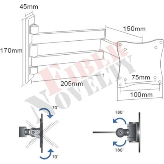 Držák na televize a monitory Fiber Novelty FN101 Kvalitní otočný držák na monitor nebo menší televizi do 32", možnost velkého náklonu, nastavitelná vzdálenost od zdi Kvalitní televizní držák na monitory a menší televize. U držáku je velmi snadná montáž, protože je dodáván ve smontovaném stavu a nastavení obrazovky do požadované polohy je otázkou vteřin. Tento držák na monitory má výborné řešení sklonu, nevznikají žádné vůle a náklon je možný nahoru i dole v úctyhodných až 70 stupních. Držák FN101 unese zátěž až 15kg a doporučujeme ho pro obrazovky s úhlopříčkou do 32". Nástěnná konzola pro zavěšení lcd led obrazovek, otáčení do stran, náklon, změna vzdálenosti od zdi - Fiber Novelty FN101 Technické údaje: max. zatížení 15kg podporuje VESA standard 75x75 a 100x100 doporučujeme na monitory nebo menší televizory s úhlopříčkou 15" až 32" možnost náklonu až +/- 70° otočný do stran +/- 90° minimální vzdálenost obrazovky od zdi 50mm maximální vzdálenost obrazovky od zdi 370mm kvalitní konstrukce z hliníku snadné nastavení obrazovky do požadované polohy instalační materiál součástí balení záruka 5 let Držák Fiber Novelty FN101 podporuje VESA standardy: VESA 75x75 VESA 100x100 Držáky Fiber Novelty FN101 je vhodný na všechny typy televizorů a monitorů, které podporují VESA standard 75x75 nebo 100x100 a jejichž hmotnost je maximálně 15kg. Na velikosti úhlopříčky nezáleží, je možné zavěsit jak větší, tak i menší obrazovky..