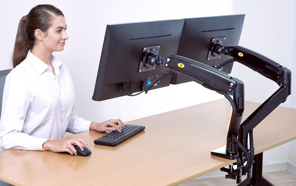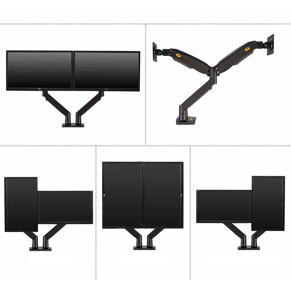 Dvojmonitorový stolní držák NB F195AB Profesionální stolní držák na 2 monitory 19-37", 3D nezávislé nastavení polohy, design, kvalita, ergonomie, VESA 75x75 a 100x100, nosnost 18kg Špičkový profesionální stolní držák pro zavěšení 2 monitorů a jejich nezávislé nastavení polohy: otáčení do stran, nastavení výšky, nastavení vzdálenosti od stolního úchytu, náklon, rotace obrazovky. korekce roviny. Hmotnost každého monitoru musí být v rozmezí 3-9kg. Balení obsahuje 2 typy úchytů na stolovou desku, instalační materiál a návod. Barevné provedení černé. Záruka 3 roky. Stolní držák na 2 monitory 19-37" do kanceláře nebo pracovny NB F195AB Technické údaje: celková nosnost 18kg hmotnost každého monitoru musí být v rozmezí 3 ÷ 9 kg podpora VESA standardu 75x75 a 100x100 v případě potřeby za příplatek možnost rozšíření VESA na 200x100 nebo 200x200 doporučená úhlopříčka monitorů 19" až 37" nezávislé nastavení výšky: min. 220mm, max. 565mm nezávislé otáčení monitoru do stran +/- 180° nezávislé naklonění monitoru +53° až -8° nezávislá rotace monitoru - otočení monitoru na šířku nebo na výšku, korekce roviny nezávislé nastavení vzdálenosti od stolního úchytu: 0mm až 700mm uchycení na stolové desky o průměru 10mm až 90mm balení obsahuje 2 typy úchytů na stolové desky (svěrák na okraj stolu + šroubovice do prostoru stolu) 2x USB port vynikající kvalita, krásný design snadné nastavení polohy monitorů spolehlivost, bezpečnost barevné provedení černé, stříbrné nebo bílé záruka 3 roky Polohovatelný stolní držák 2 monitorů do kanceláří a pracoven NB F195AB Dvojmonitorový stolní držák podporuje VESA standardy: VESA 75x75 VESA 100x100 za příplatek rozšíření na VESA 200x100 za příplatek rozšíření na VESA 200x200.