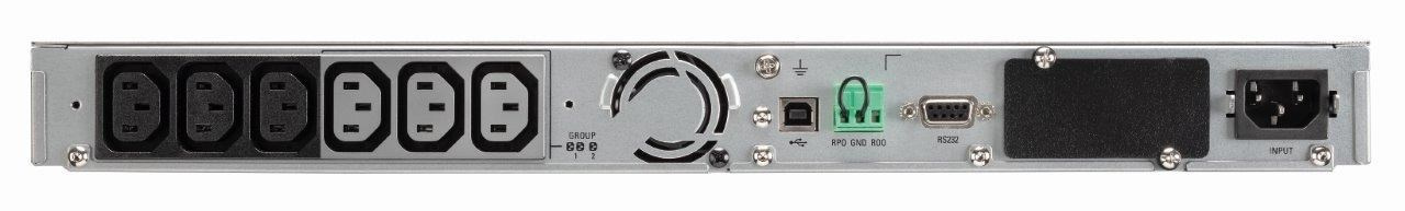 - Nový grafický LCD displej poskytuje na jedné obrazovce základní informace o stavu UPS a o měřených veličinách (v sedmi jazycích podle volby). K dispozici jsou rovněž rozšířené možnosti konfigurace pomocí srozumitelných navigačních tlačítek.
