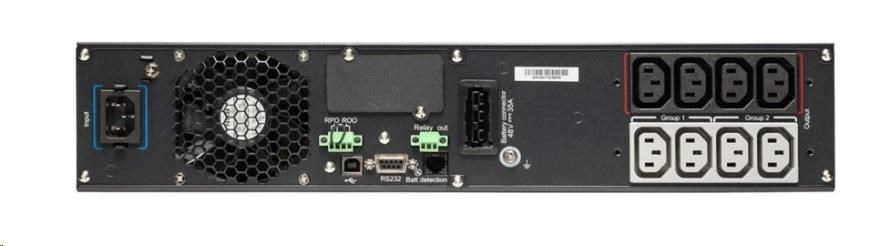 | Komunikace | USB port (kompatibilní s HID) Sériový port (RS232) Mini svorkovnice pro dálkové zapnutí / vypnutí (ROO) Mini svorkovnice pro vzdálené vypnutí napájení (RPO) Mini svorkovnice pro výstupní relé Bezpotenciálové kontakty (3 výstupy, 1 vstup, optočlen, DB9) |