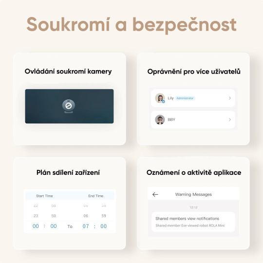 ROLA Mini dokáže nejen bavit, ale i hlídat. Sleduje pohyb a neobvyklé zvuky a pošle vám upozornění přímo do telefonu. Může tak fungovat jako mobilní domácí strážce, který nabízí mnohem víc než běžná statická IP kamera. Ať už chcete pobavit svého psa nebo kočku, nebo se podívat, jak se doma daří dětem, ROLA Mini vám umožní být vždy na dosah – odkudkoli.