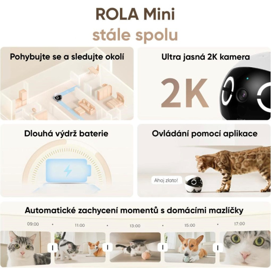 Kamera s rozlišením 2K a širokým zorným úhlem 137° zachytí každý důležitý moment, zatímco obousměrný zvuk umožní mluvit se zvířetem nebo třeba s dětmi doma. ROLA Mini zvládá i vzdálené videohovory – stačí jediné klepnutí v aplikaci a můžete se spojit s kýmkoli, kdo má robota připojeného. Díky vysokokapacitní baterii 5000 mAh robot funguje zcela samostatně, až 25 dní. Jeho odolná konstrukce a pohyblivost zaručují, že zvládne i hravé nárazy nebo nečekané překážky.