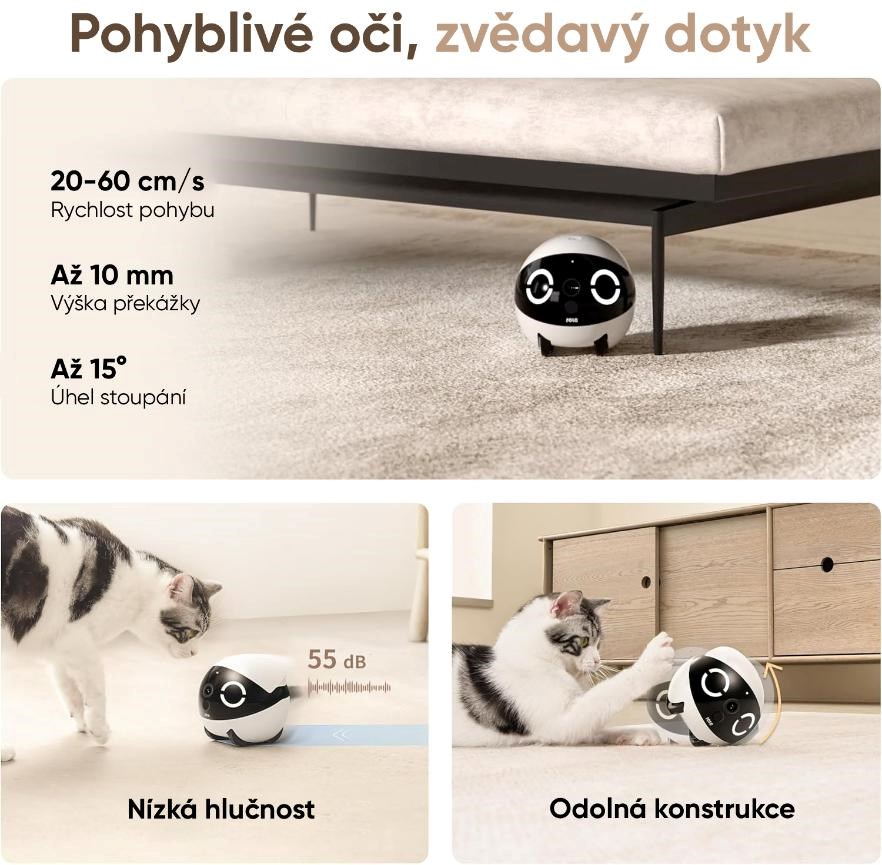 - Dálkové ovládání přes aplikaci – ovládejte robota odkudkoli a sledujte, co váš mazlíček právě dělá.