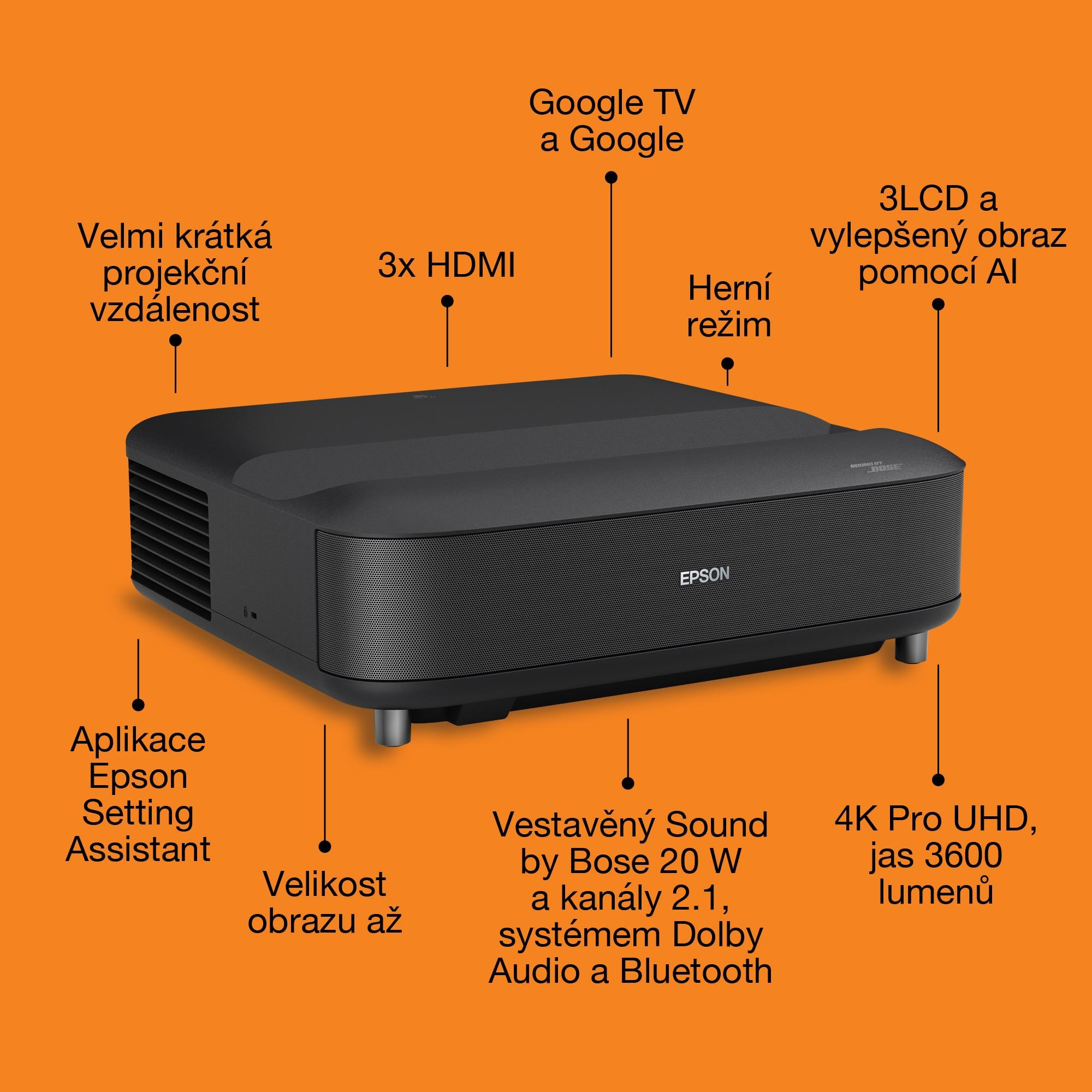 Použití projektoru: Domácí kino / hraní her / streamování / televize a set-top boxy; Typ projekce: Ultra Short Throw (UST); Skutečné rozlišení projektoru: 4K PRO-UHD (3840 × 2160); Projekční poměr: 16:9; Projekční vzdálenost (min) (m): 0,3; Projekční vzdálenost (max) (m): 0,7; Úhlopříčka obrazu (max) ("): 120; Technologie: 3LCD (RGB se závěrkou s kapalnými krystaly C2 Fine); Zdroj světla: Laser (životnost až 20 000 h); Kontrast (hodnota : 1): 5 000 000; Jas (ANSI lumenů): 3 600; Zvuk: Sound by Bose + Dolby Audio + Bluetooth (20 W 2.1kanálový systém); Smart funkce: Google TV, Google Assistant, Chromecast, režim ALLM.... více