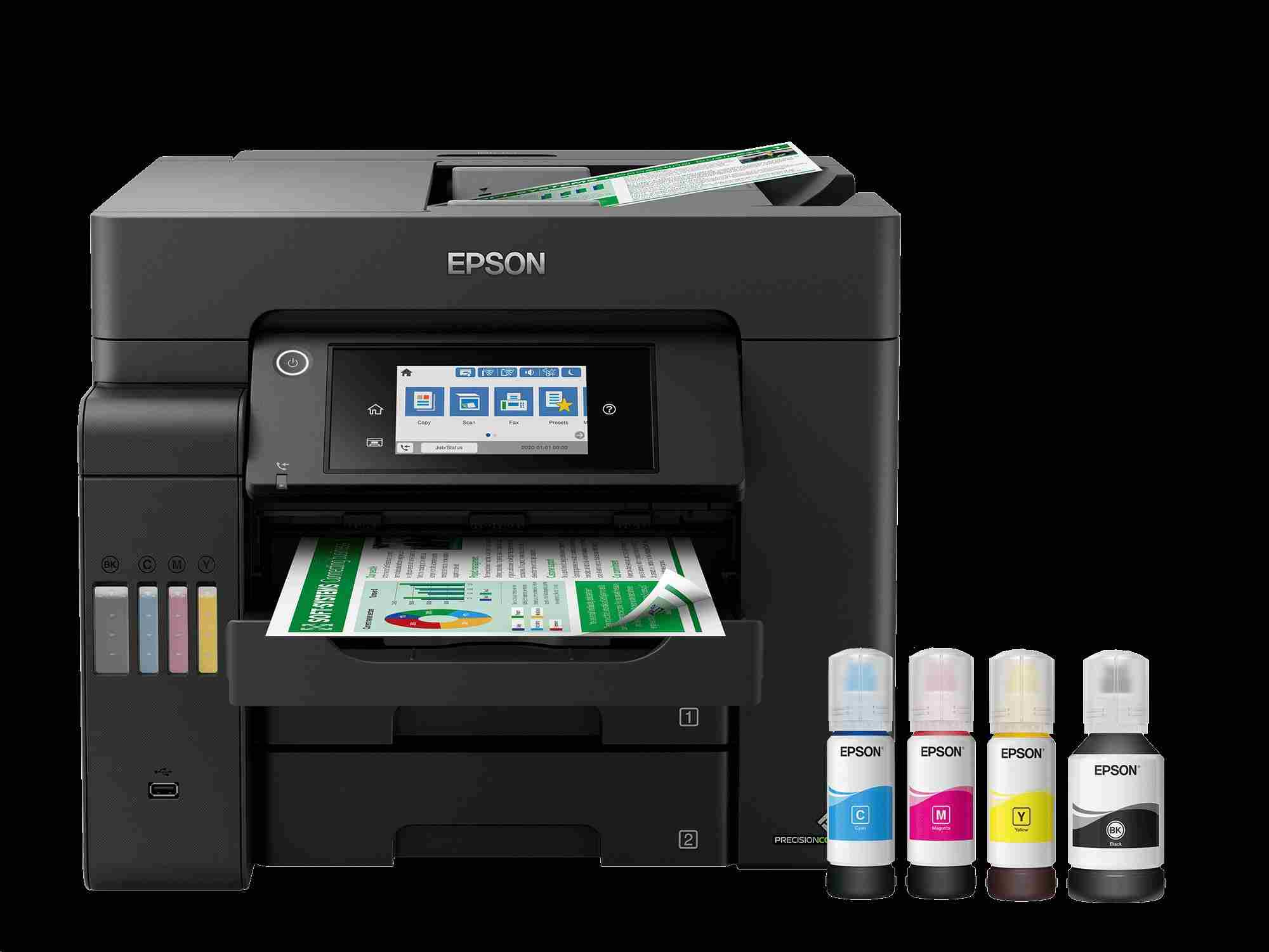 S touto snadno použitelnou tiskárnou EcoTank můžete tisknout, skenovat, kopírovat a faxovat dokumenty při opravdu výjimečně nízkých nákladech na jednu stránku. Veškeré úlohy lze zvládat rychle díky vysoké rychlosti tisku a skenování, dvěma předním zásobníkům na 250 listů, zadnímu podavači na 50 listů a automatickému podavači dokumentů o kapacitě 50 listů. Díky funkcím mobilního tisku, Ethernet připojení a dotykovému LCD displeji s úhlopříčkou 10,9 cm můžete tisknout tak, jak právě potřebujete.