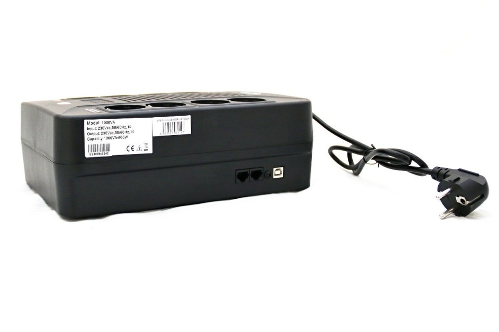 Záložní zdroj "Line interactive" EA280P kompaktní velikosti. Konstrukce umožňuje i zavěšení na zeď Na čelním panelu vypínač ON/OFF a indikační LED