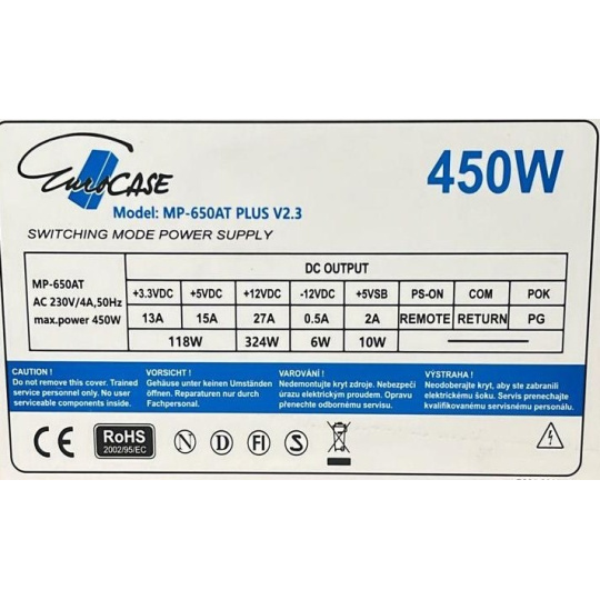 Napájecí zdroj ATX značky Eurocase s výkonem 450W. Je osazen 120mm ventilátorem a pasivním PFC (Power factor correction). Otáčky ventilátoru jsou řízeny termoregulací. Zdroj splňuje požadavky na elektrickou bezpečnost a elektromagnetickou kompatibilitu. Zdroj vyhovuje i směrnici 2005/32/EU = příkon v pohotovostním režimu.