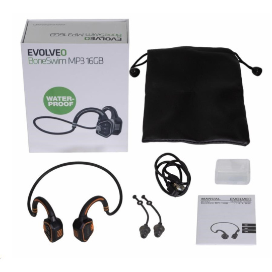 | Obsah balení | EVOLVEO BoneSwim MP3 sluchátka Ochranný přenosný obal Magnetický napájecí kabel Ucpávky do uší v krabičce + uchycení Uživatelský manuál |