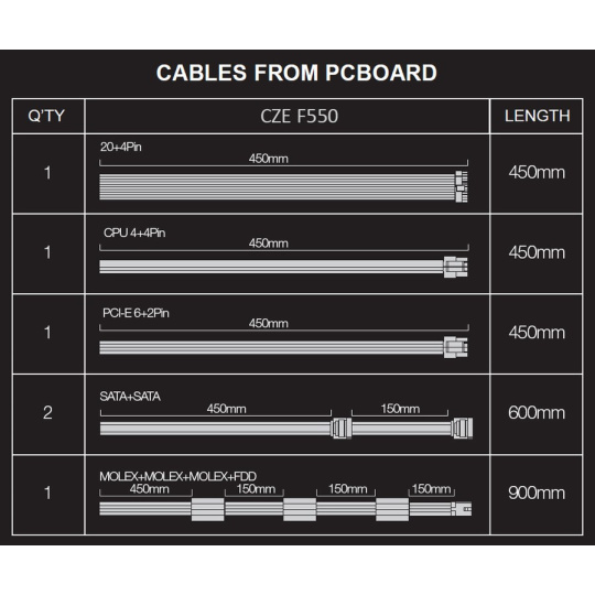 • 1x MOLEX, 450mm + MOLEX 150mm + MOLEX 150 mm + FDD 150 mm
