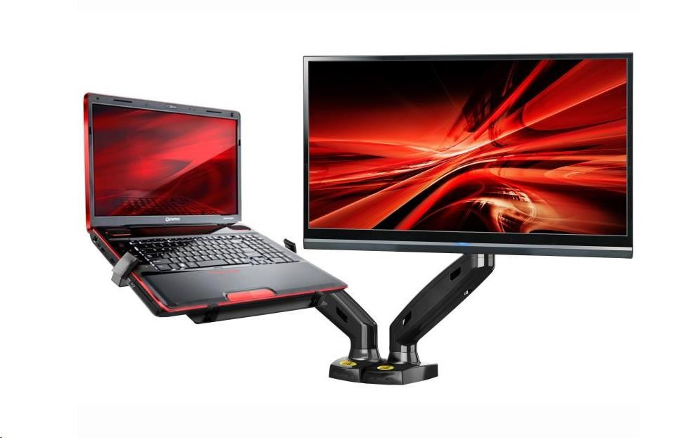 Fiber Mounts H3F160 držák notebooku a monitoru Sestava držáku na monitory NB F160 + držáku na notebook Ergosolid NBH3 za zvýhodněnou cenu, umožňuje dát na držák monitor 17" - 27" a notebook 10,1" - 17", otáčení do stran, naklápění, délkové a výškové polohování, nosnost 2x 9 kg Špičkový stolní držák do kanceláře, firmy nebo domácnosti pro zavěšení monitoru a notebooku. Držák umožňuje kompletní polohovatelnost jak monitoru tak i notebooku - otáčení do stran, náklon, délkové a výškové nastavení, korekci roviny. Ramena mají systém pro vedení kabeláže. Uchycení je možné na všechny typy stolů nebo desek o síle 10mm až 100mm, jsou možné 2 způsoby uchycení - na kraj stolové desky nebo kamkoliv do prostoru (ukotvení skrz stolovou desku - nutný otvor). Stolní držák pro uchycení notebooku (laptopu) a monitoru Fiber Mounts H3F160 je vynikající kvality, velmi pěkného designu a poskytujeme na něj záruku 5 let. Stolní držák na monitor a notebook do kanceláře, pracovny, firmy nebo domácnosti Fiber Mounts H3F160 Technické údaje: možné zatížení každého ramene 2kg až 9kg celková nosnost držáku 18kg podporuje VESA standardy 75x75 a 100x100 doporučená úhlopříčka monitoru 17" až 27" na notebooky a laptopy 10,1" až 17" výškové polohování 250mm otočný +180° / -180° náklon +35° / -50° funkce pivot - otočení monitoru do horizontální nebo vertikální polohy korekce roviny monitoru i notebooku vhodný pro uchycení všech notebooků a laptopů, které mají šířku 255-380 mm systém pro vedení kabeláže výborná kvalita krásný design záruka 5 let.