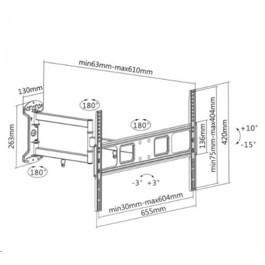 Technické údaje: maximální zatížení 35kg podpora VESA standardu 75x75 až 600x400 otáčení do stran +90° až -90° náklon +10° až -15° nastavitelná vzdálenost od zdi minimální vzdálenost od zdi 63mm maximální vzdálenost od zdi 610mm korekce roviny +3° až -3° kvalitní konstrukce snadná montáž a nastavitelnost úchytky na kabeláž barva černá záruka 5 let Držák Fiber Mounts AX798 podporuje VESA standardy: VESA 75x75 VESA 100x100 VESA 200x100 a 100x200 VESA 200x200 VESA 300x200 a 200x300 VESA 300x300 VESA 400x200 a 200x400 VESA 400x300 a 300x400 VESA 400x400 VESA 500x300 VESA 500x400 VESA 600x400 •VESA 200x200 •VESA 300x200 •VESA 300x300 •VESA 400x200 •VESA 400x300 •VESA 400x400 •VESA 600x400.