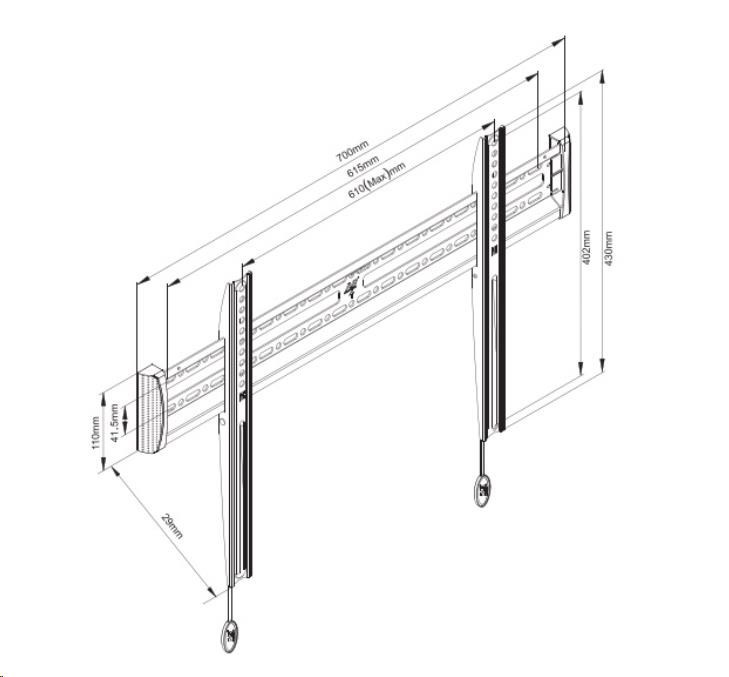 Fixní držák Tv NB C3F Fixní držák na Tv 43-80", VESA 75x75 až 600x400, vzdálenost Tv od zdi 29mm, systém click-connect pro automatické upnutí Tv na držák, nosnost 56kg Fixní držák prémiové kvality na LCD LED Tv 43-80". Držák podporuje VESA standardy 100x100 až 600x400, vzdálenost Tv od zdi je 29mm. Díky systému click-connect se televizor po zavěšení na držák automaticky upne proti nechtěnému vysazení, uvolnění je pomocí táhel. Na držák je možné zavěsit všechny typy a značky televizorů s hmotností až 56kg. Fixní držák LCD LED plazma Tv NB C3-F Technické údaje: nosnost 56kg na televizory s úhlopříčkou 43" až 80" podporuje VESA standard 100x100 až 600x400mm vzdálenost od zdi 29mm automatické zajištění televize proti vysazení - systém click-connect vynikající kvalita, velmi pevný a naprosto spolehlivý držák na Tv snadná a rychlá instalace balení obsahuje sadu šroubů, vruty a hmoždinky záruka 5 let Nástěnný fixní držák na Tv 43-80" v prémiové kvalitě - VESA 100x100 až 600x400, vzdálenost od zdi 29mm, systém click-connect, nosnost 56kg NB C3F Fixní držák na televize NB C3F podporuje VESA standardy: VESA 100x100 VESA 200x100 a 100x200 VESA 200x200 VESA 300x100 a 100x300 VESA 300x200 a 200x300 VESA 300x300 VESA 400x200 a 200x400 VESA 400x300 a 300x400 VESA 400x400 VESA 600x200 VESA 600x400.