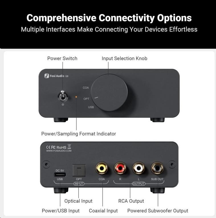 Kompaktní a robustní stolní DAC v hliníkovém těle, čip AKM AK4493S, procesor XMOS XU316 s operačním zesilovačem OPA1612. Formáty PCM 32bit/768 kHz a DSD512 (Windows, macOS i Linux). Vstupy: USB-C, optický a koaxiální. Výstupy: RCA, Sub. THD < 0,00012 %, SNR ? 121 dB, dynamický rozsah 121 dB. Napájení 5V/2A. Součást balení: USB-C kabel, napájecí kabel / adaptér, uživatelský manuál..