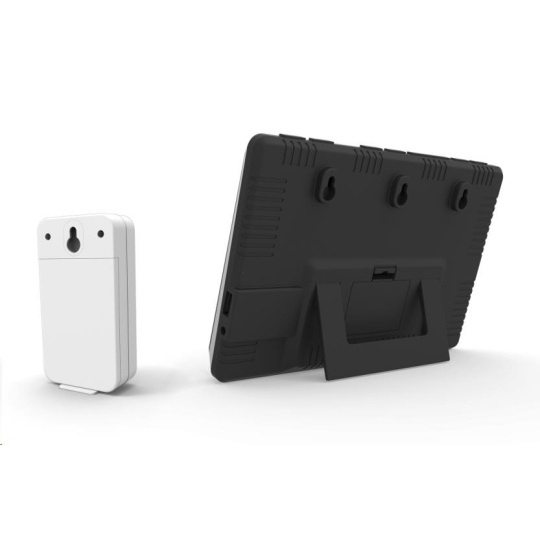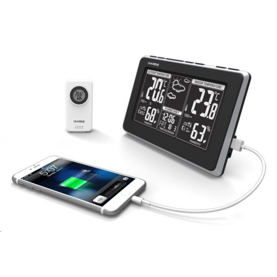 Meteorologická stanice s inverzním LCD displejem s časem řízeným rádiovým signálem DCF-77, budíkem, měřením vnitřní teploty a relativní vlhkosti, bezdrátovým čidlem pro měření vnější teploty a relativní vlhkosti a USB portem pro napájení externích zařízení.