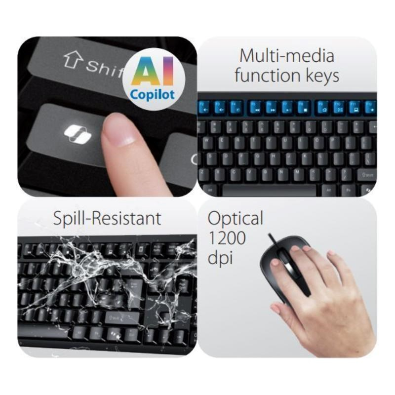 Kvalitní set klávesnice a myši pokryje všechny vaše základní kancelářské potřeby. Klávesnice disponuje klávesou pro vyvolání AI asistenta Microsoft Copilot v systému Windows a řadou programovatelných funkčních kláves, které lze využít pro snadnější ovládání hudebního přehrávače, sociálních sítí či kancelářských programů. Klávesnice je odolná proti polití, takže zůstane funkční i v případě nečekané nehody. Myš je vybavena optickým senzorem s rozlišením snímače 1200 DPI, které zaručí hladké a přesné ovládání.