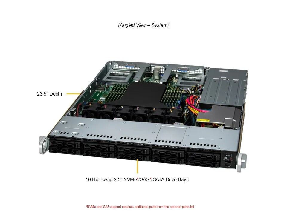 | Úložiště | 8 hot-swap 2.5" NVMe/SATA/SAS pozic, volitelně až 12 pozic s dalšími komponenty |