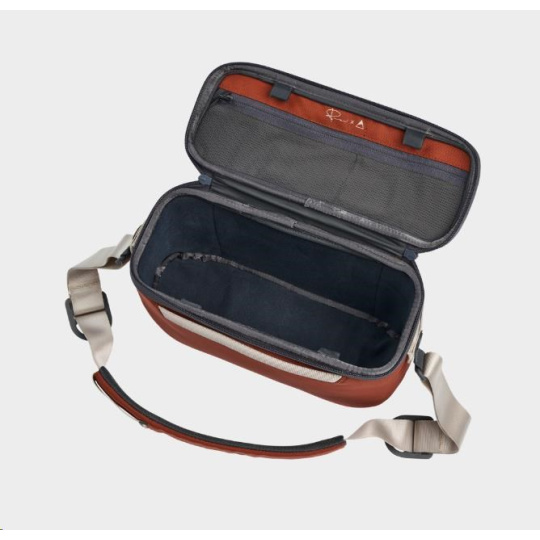 Odolný kovový rám zajišťuje, že si brašna zachová svůj tvar, a vnitřek z materiálu Nylex pevně drží rozdělovací suchý zip. Inovativní přepážky ve tvaru harmoniky, některé s přidanou policí, dále maximalizují prostor. Tento závěs je kombinací funkčnosti a řemeslného zpracování na míru fotografům.